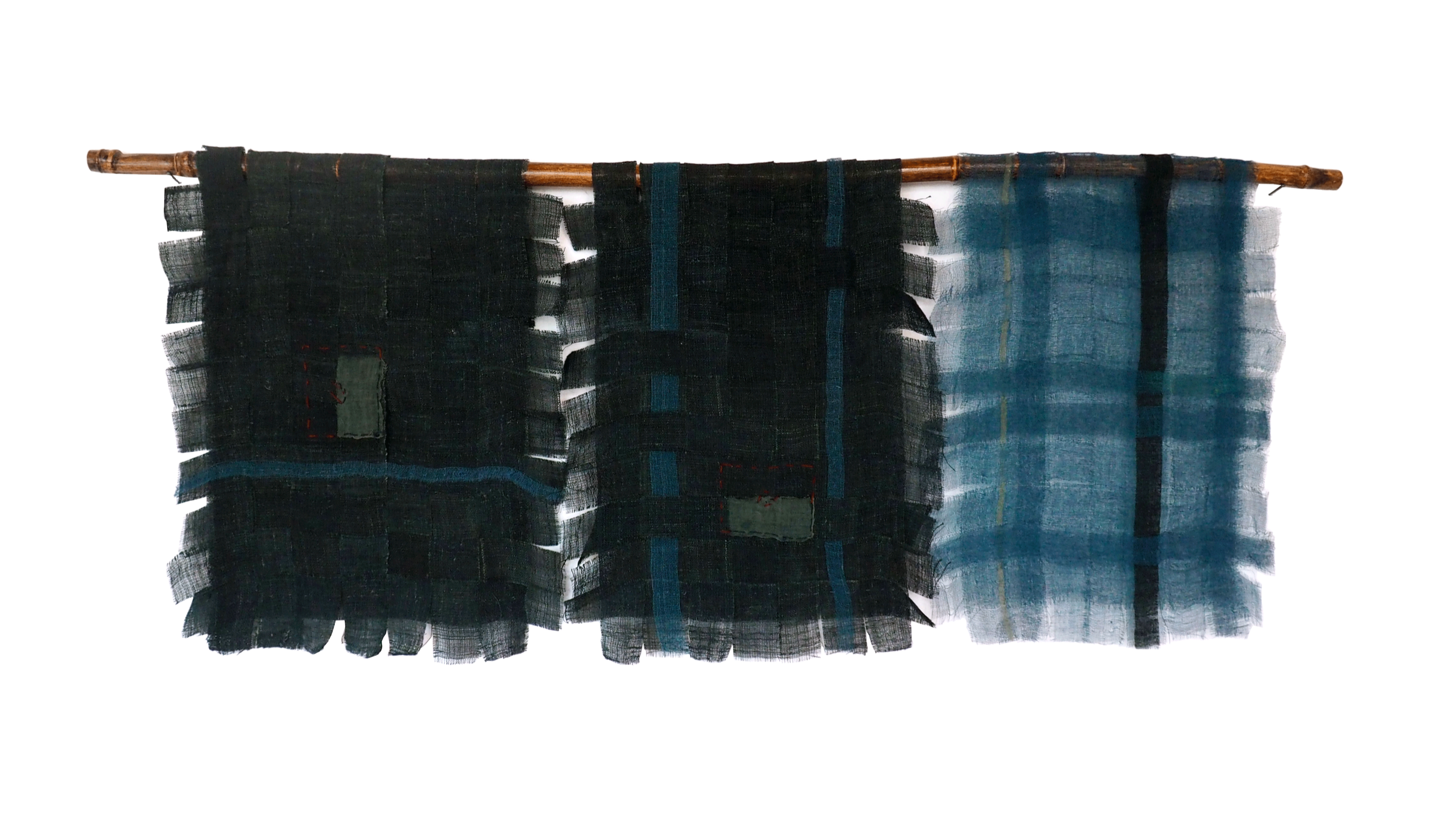 This triptych was made slowly, using materials shaped by time and use. It brings together two antique Japanese mosquito net fabrics from the 1940s, dyed with natural indigo. The fabric shows clear signs of wear, areas softened over time, small holes repaired with leftover textiles and simple embroidery. These repairs sit alongside the original cloth, linking past and present. The mix of darker and faded blues creates a steady, quiet rhythm, where care and repair become part of the work itself.